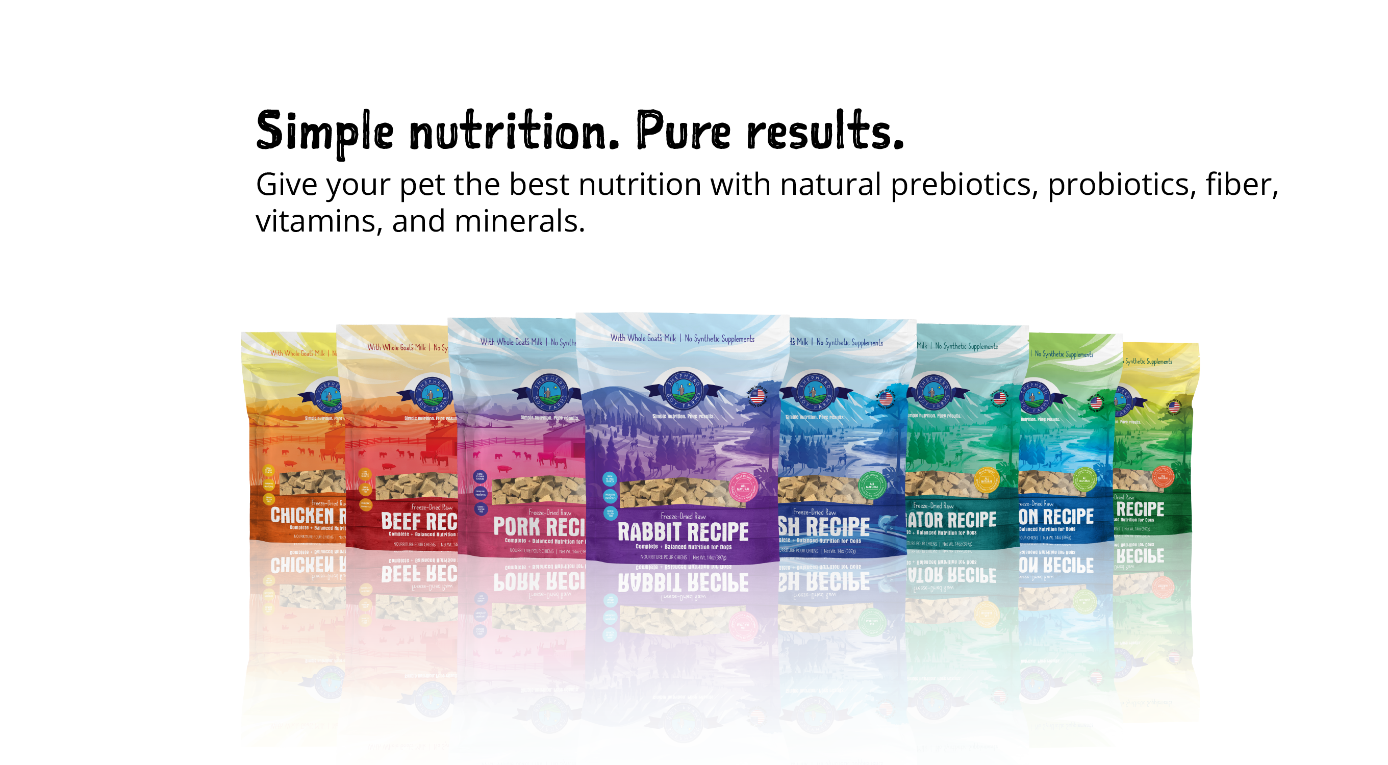 Our freeze dried food is different because we use real, organic produce as well as goat’s milk to naturally provide essential vitamins and minerals. We do not use synthetic vitamins and minerals like many companies. Made with USA sourced meat, it is pure, wholesome nutrition your dog will love.