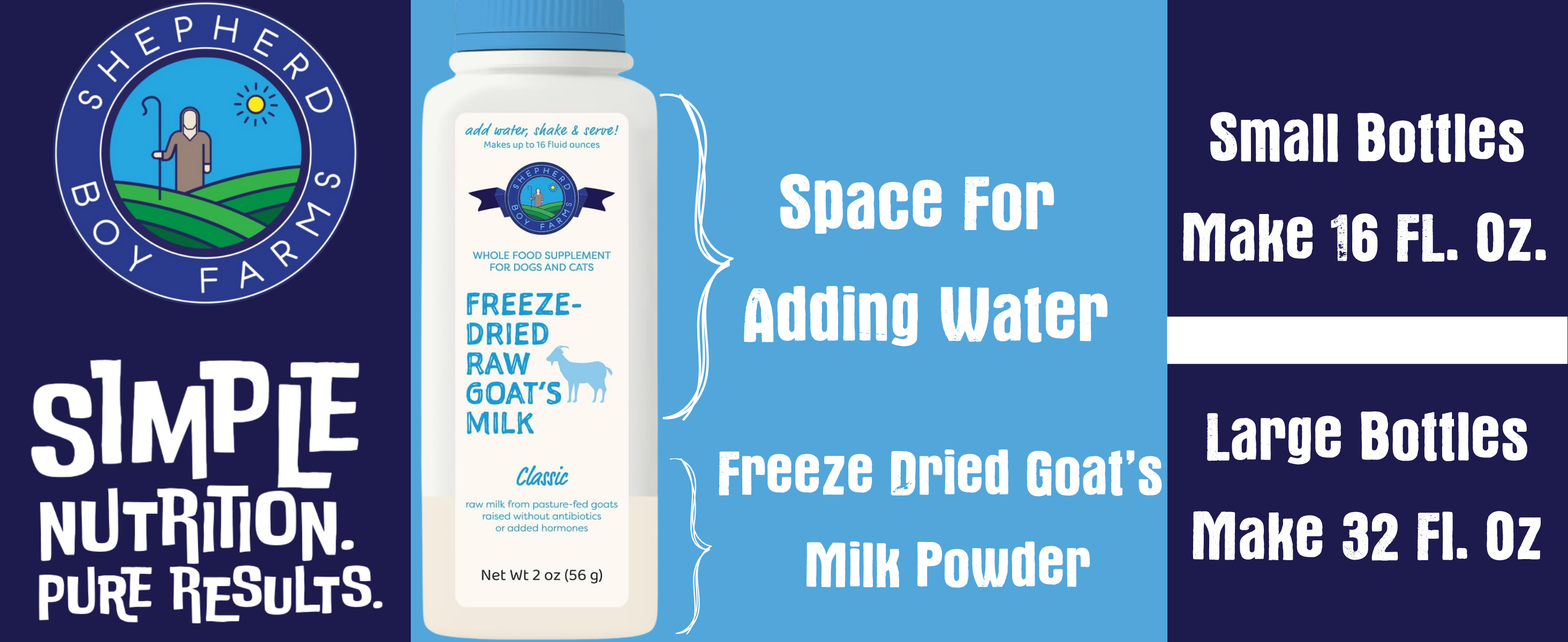 Tired of the thawing, the waiting, and the messy cleanup - just to give your pet the raw, wholesome benefits of fresh goat’s milk? At Shepherd Boy Farms, we believe nourishing your pet should be as simple as it is rewarding. Try our Freeze-Dried Goat’s Milk: all the farm-fresh nutrition your pet loves with none of the inconvenience. Simply add water, shake, and serve - no defrosting, no planning, no stress. It’s real milk made effortlessly easy, so you can spend less time prepping and more time enjoying those happy tail wags and contented purrs.