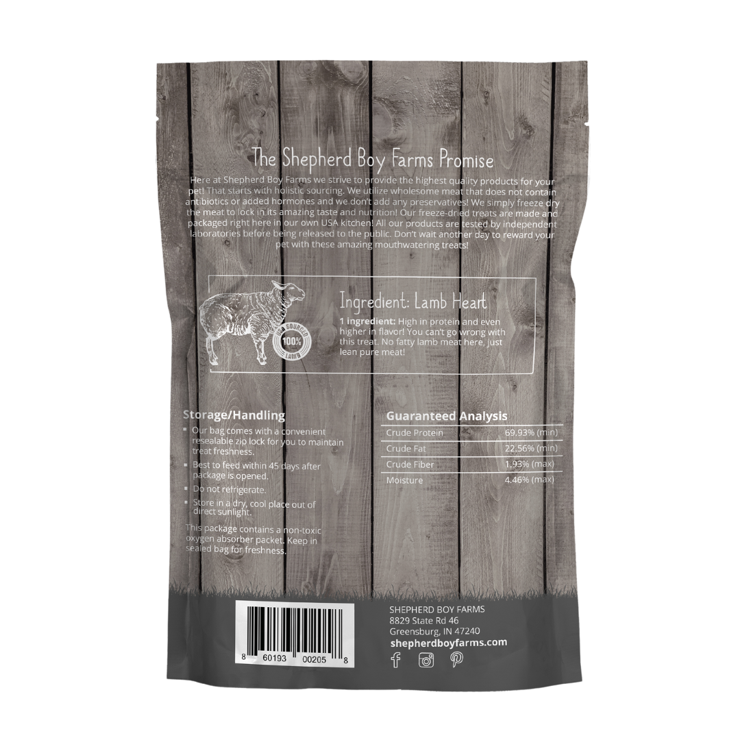 Bags of Shepherd Boy Farms freeze-dried chicken breast and beef hearts pet treats.