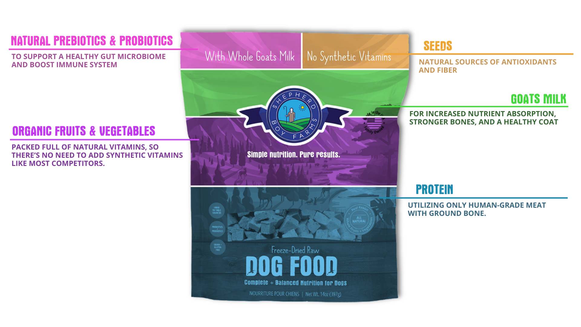 Shepherd Boy Farms Freeze Dried Dog Food on wooden background